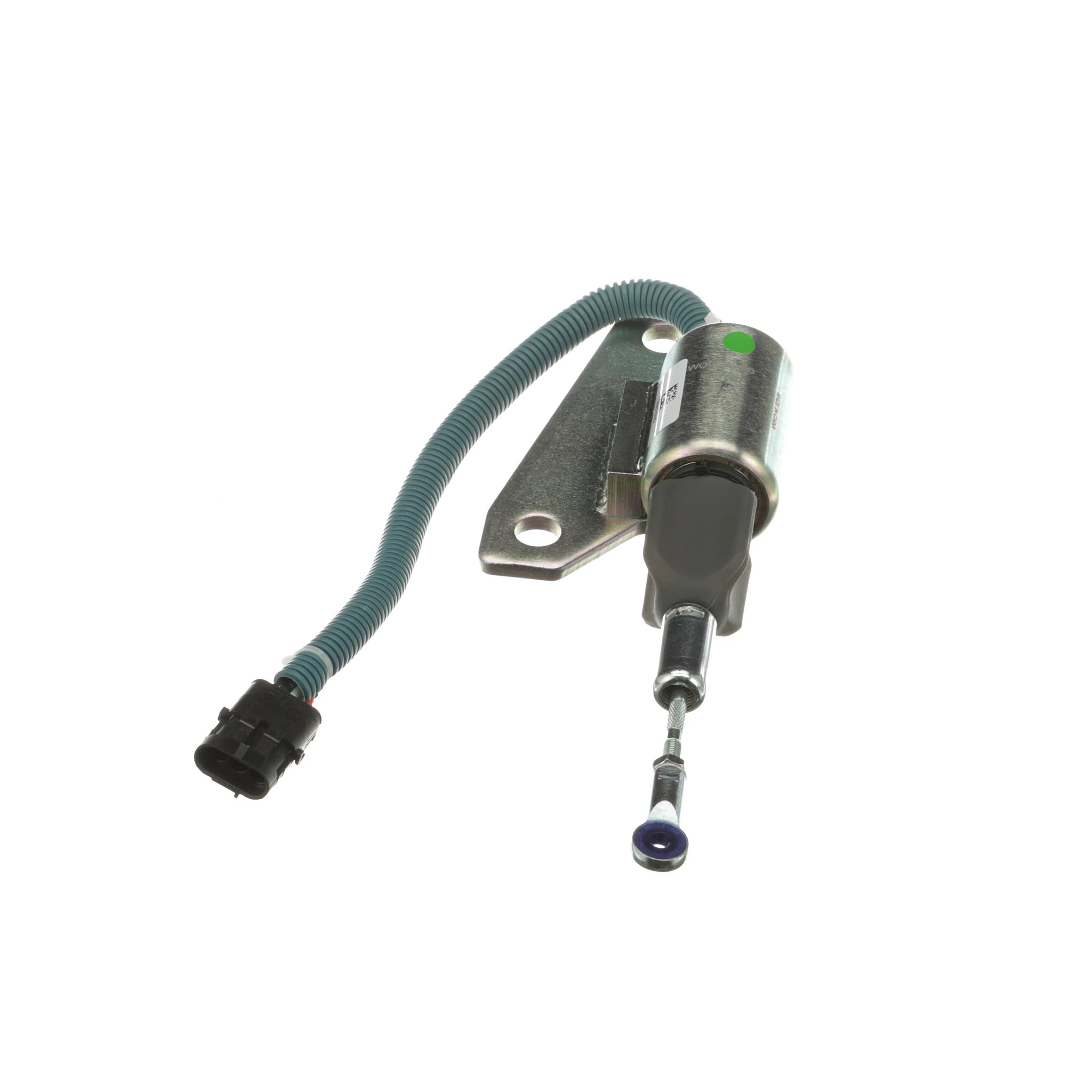 Solenoid #87435488 immediately stops the fuel supply to your engine when it's turned off — important for maintaining safety. Features a 3-way sealed connector with a green flame retardant polypropylene conduit, a cable tie clamp, a mounting plate with two holes and a spherical rod end.