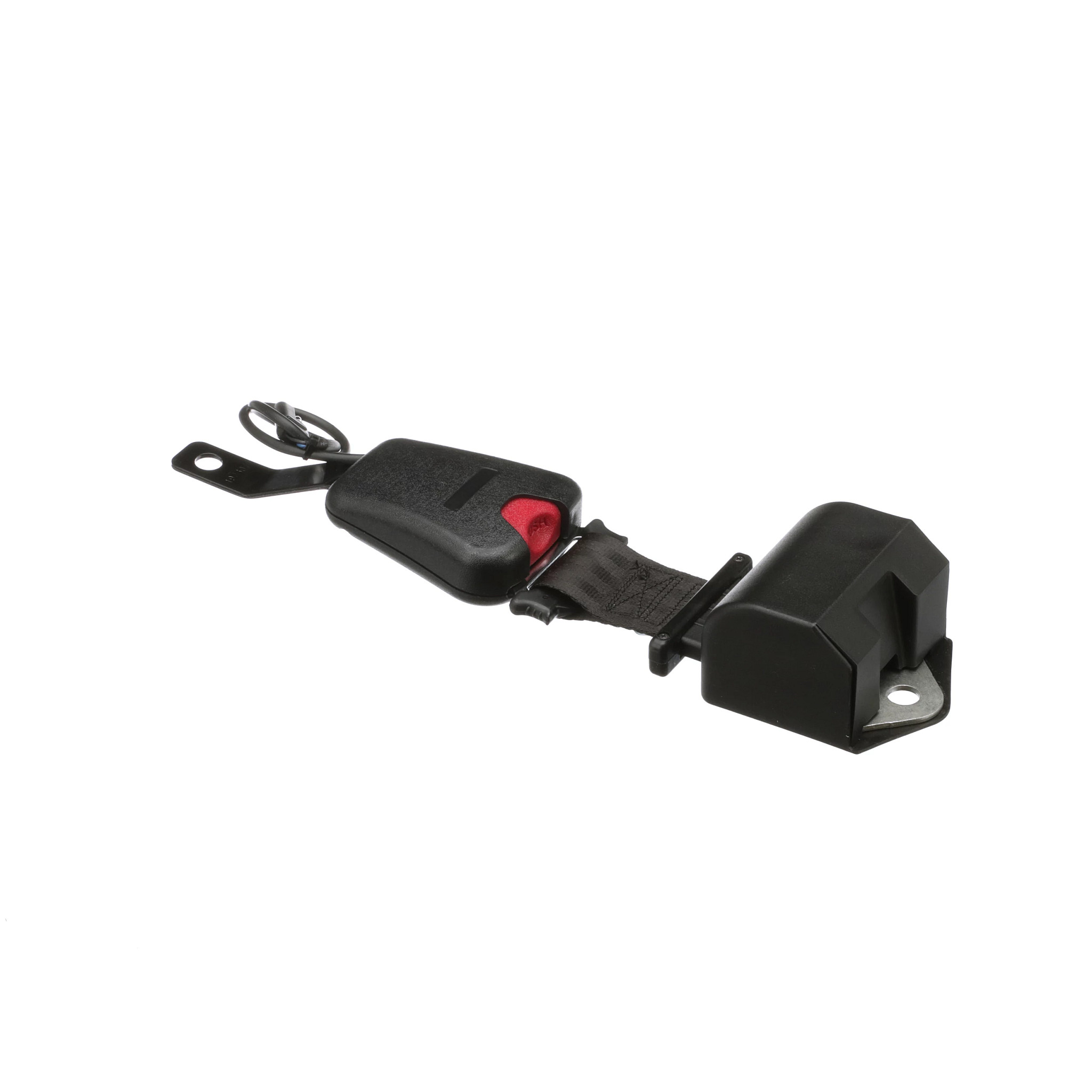 Seat Belt #84174257 protects you from injuries in case of accidents. It features an automatic locking retractor with a black boot, a steel bracket and a red release latch.